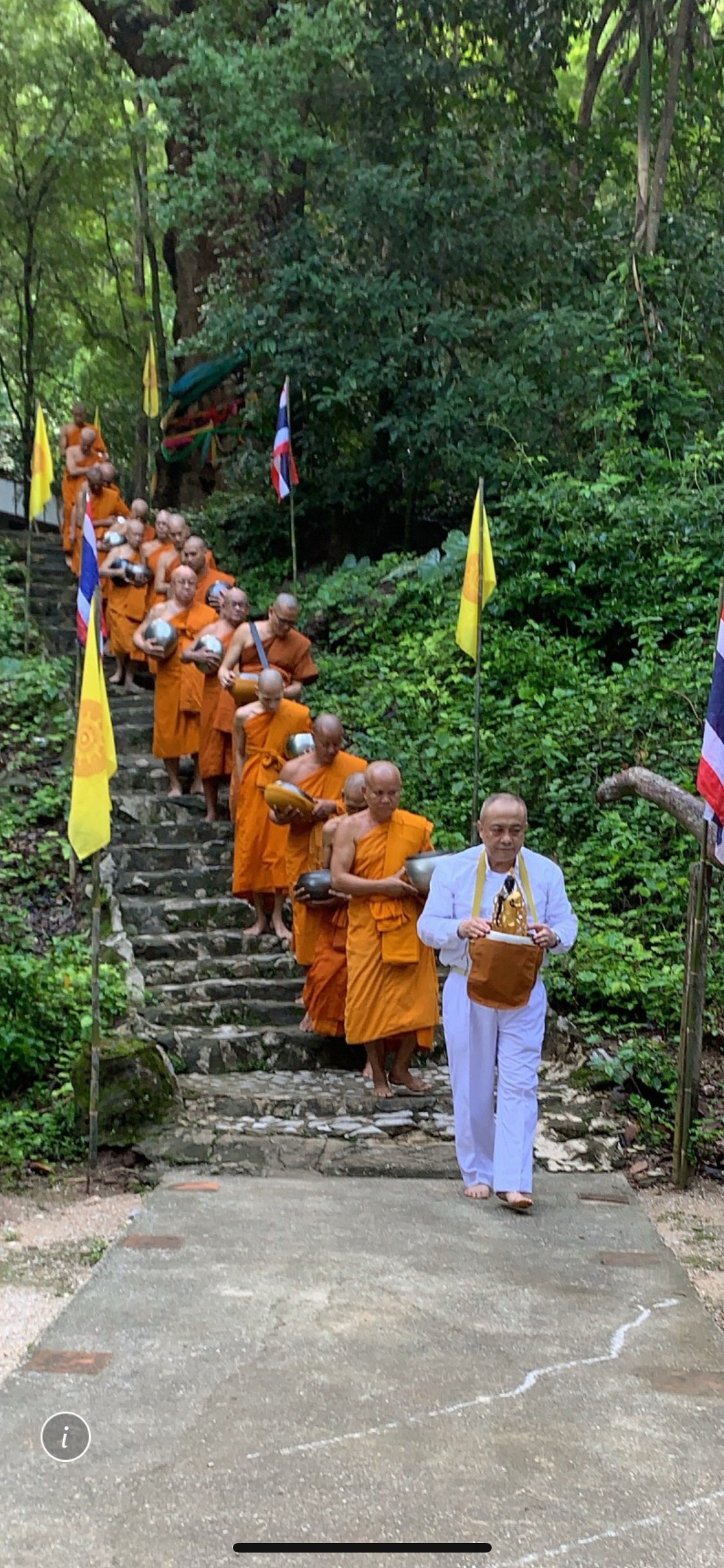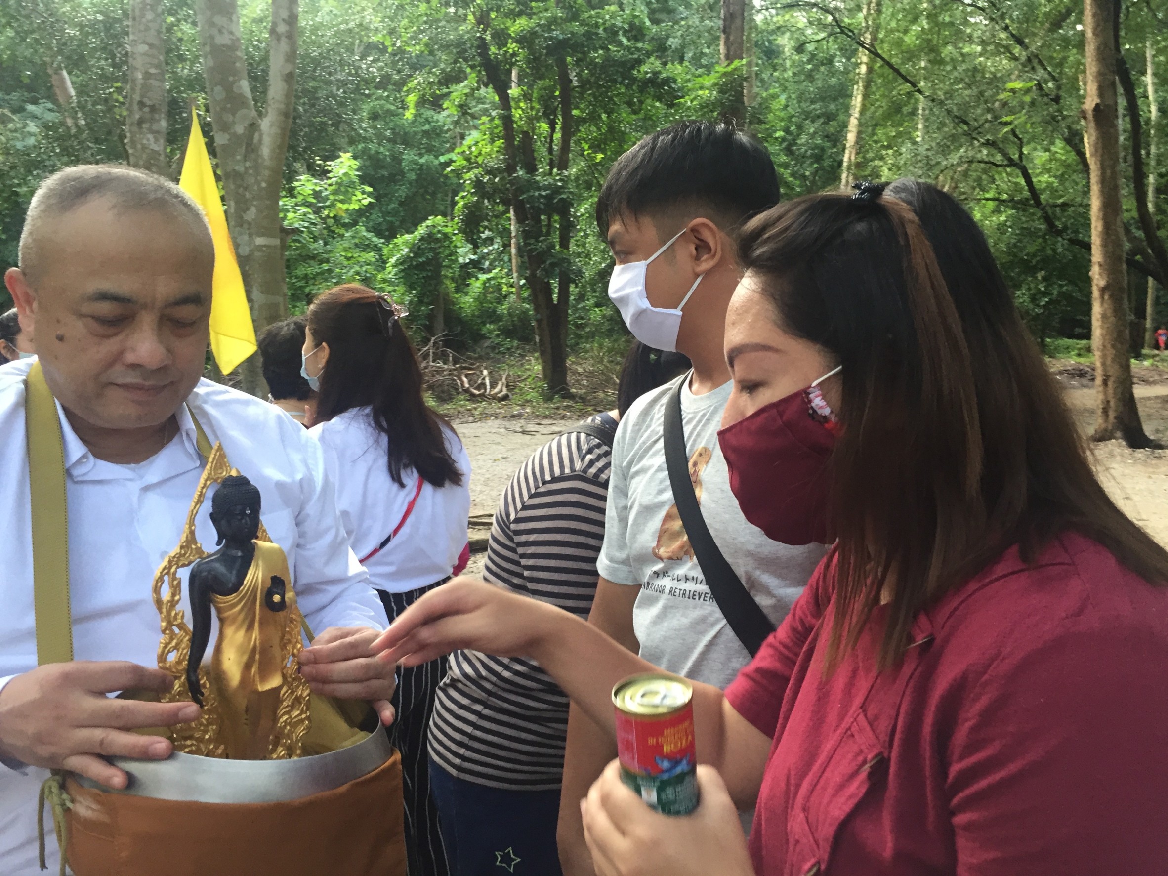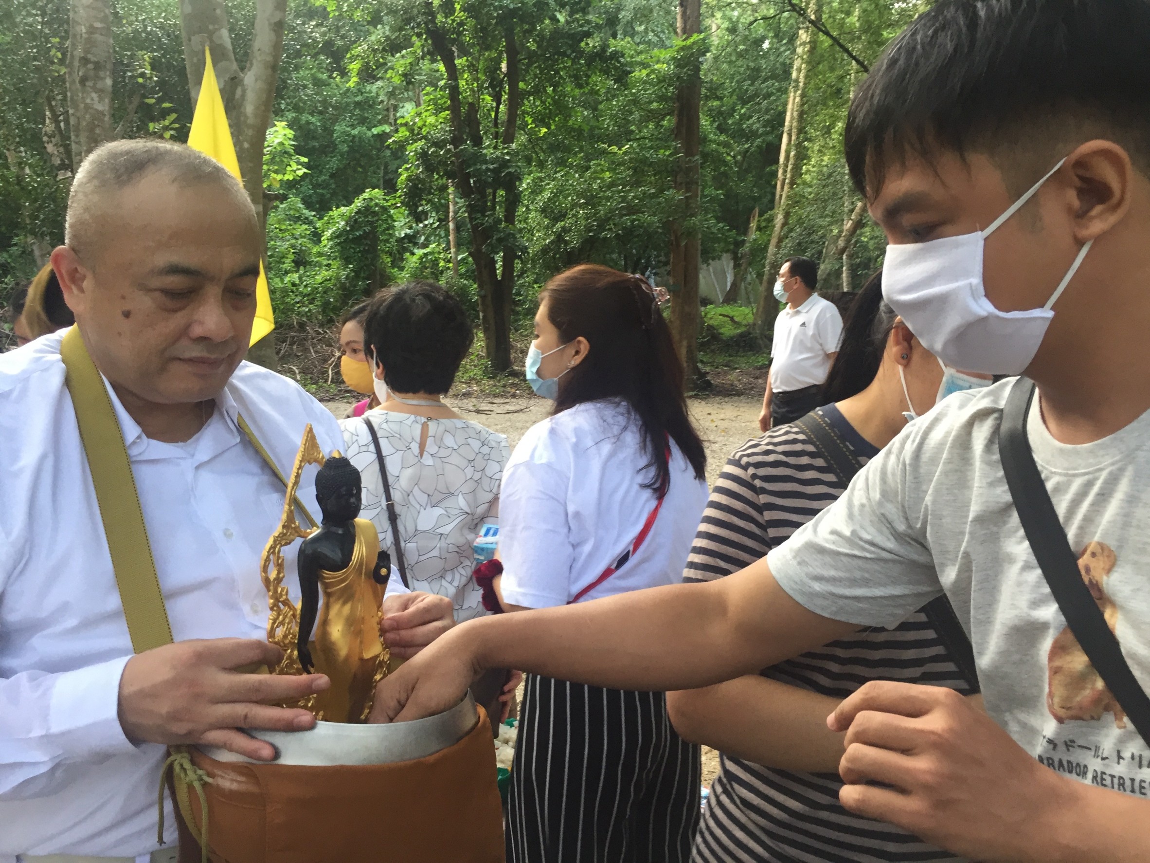 The Buddhist from the town went to make merit and give alms to the monk.